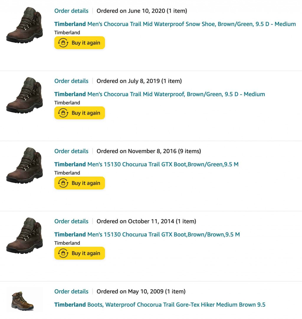Or, take my hiking boots. Every five to seven years, I replace a pair of Timberland Chocorua. (The Amazon history belo0w makes it look like I’m ordering them more often, but that’s because I have two pairs in rotation at once: a “work” pair and a “dress” pair. Each pair lasts five to seven years.)