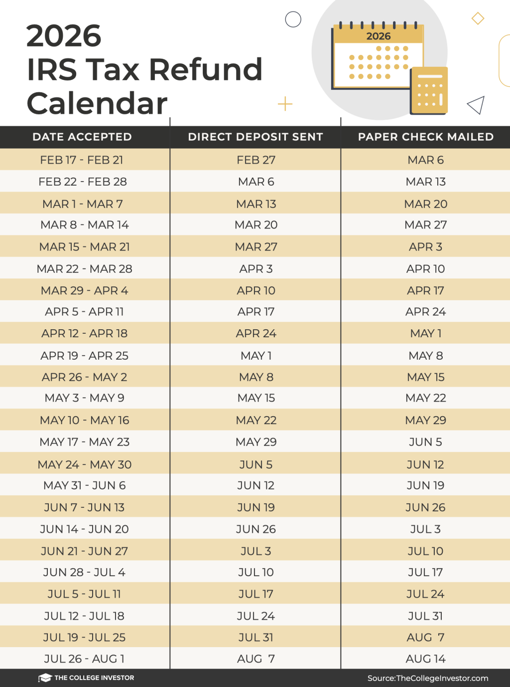 The College Investor’s annual IRS Tax Refund Calendar below shows the estimated deposit and check mailing dates based on IRS acceptance timing and direct deposit preferences. These are projections, not guarantees — but year after year, they closely match real refund data reported by our readers.